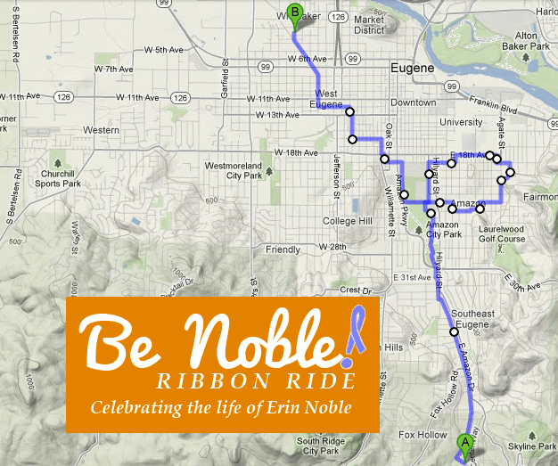 BikeInShapes is bubbling in anticipation to honor and continue celebrating the life of Erin Noble. We’re calling it the “Be Noble” ribbon ride. We will begin where many Noble mornings began, the Martin’s Trailhead off W. Amazon (See map). We’ll trot our bikes down the Amazon Creek running trail, looping Erin’s ribbon through town over to the Whitaker. The ride will conclude with fundraiser pints at Ninkasi.